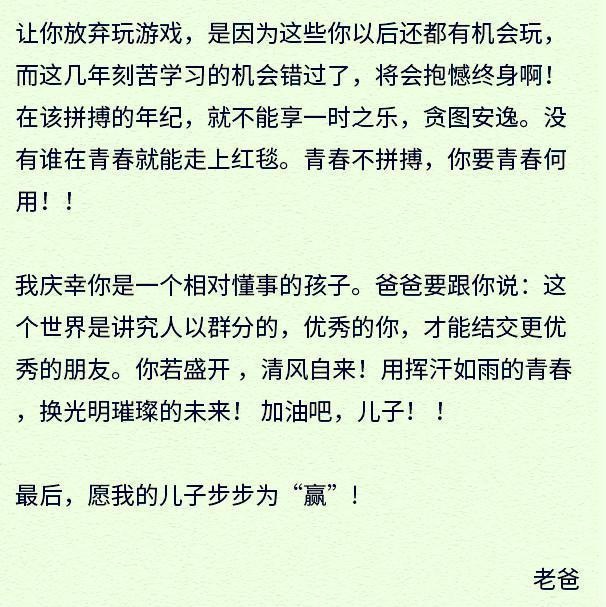 下面是一位父親寫給兒子的一封信,用誠(chéng)摯樸素的語言勸解兒子好好學(xué)習(xí)。