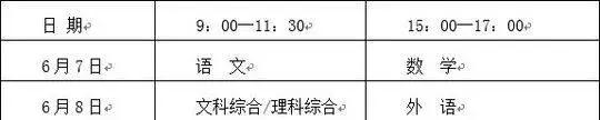 全省高考(藏、彝文一類模式高考除外)于6月7、8日統(tǒng)一組織進行。各科目考試時間(北京時間)安排如下: