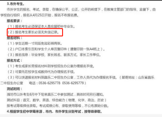 4月21日,山東濰坊昌樂二中在它的官方網(wǎng)站上發(fā)布了2018年的相關(guān)招生簡章。在“市外考生”這一欄的報名要求中,增加了一條硬性要求,那就是“報名考生家長必須無失信記錄。