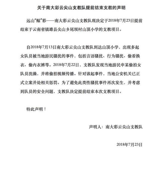 據(jù)南大彩云支教團(tuán)的招募廣告介紹,該團(tuán)是掛靠在南京大學(xué)公益學(xué)院的一個(gè)公益性組織,每年會(huì)招募一些志愿者前往云南省鎮(zhèn)雄縣進(jìn)行支教活動(dòng)。目前,該支教團(tuán)的志愿者每年都要在鎮(zhèn)雄縣尖山鄉(xiāng)山頂小學(xué)進(jìn)行支教活動(dòng)。7月23日,南大彩云支教通過(guò)官方微信公眾號(hào)發(fā)布了“關(guān)于南大彩云尖山 支教提前結(jié)束支教的聲明”,內(nèi)容為“遠(yuǎn)山‘鯨’彩——南大彩云尖山 支教隊(duì)現(xiàn)決定于2018年7月23日提前結(jié)束于云南省鎮(zhèn)雄縣尖山鄉(xiāng)尾壩村山頂小學(xué)的支教項(xiàng)目。自2018年7月13日南大彩云尖山 支教隊(duì)到達(dá)山頂小學(xué),出現(xiàn)多起女隊(duì)員被當(dāng)?shù)赜蚊耱}擾的事件,包括言語(yǔ)騷擾、行為騷擾、偷看換衣、偷內(nèi)衣褲等。2018年7月22日,支教隊(duì)發(fā)現(xiàn)當(dāng)?shù)赜蚊裆昴惩蹬呐?duì)員洗澡,并將偷拍視頻傳播。針對(duì)該起事件,當(dāng)?shù)毓矙C(jī)關(guān)已正式立案并處相關(guān)懲罰。為了避免此類性騷擾事件再次發(fā)生,并考慮到隊(duì)員的安全問(wèn)題,支教隊(duì)決定提前結(jié)束本次支教項(xiàng)目。
