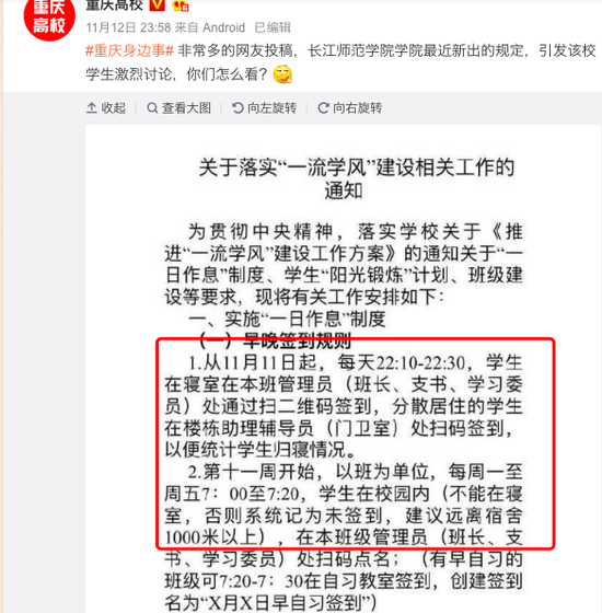對于學(xué)生的吐槽,11月13日,長江師范學(xué)院學(xué)生處一工作人員告訴澎湃新聞,上述文件是為了響應(yīng)“一流學(xué)風(fēng)”建設(shè)而制定,無論高中還是大學(xué)都是學(xué)習(xí)的地方,應(yīng)該在一定的制度下進(jìn)行。