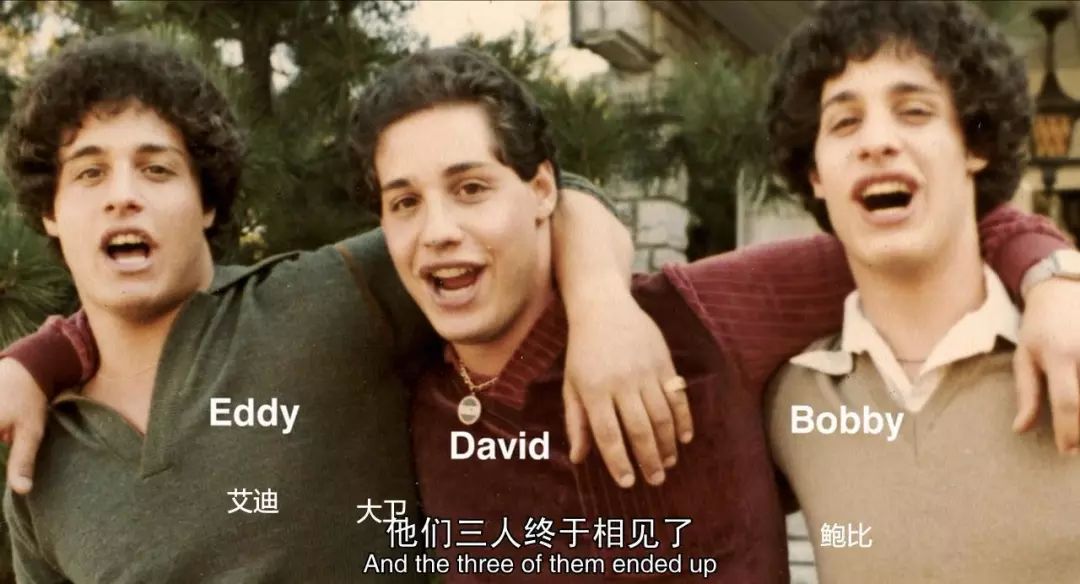 這件事因?yàn)樘^(guò)離奇罕見(jiàn)而被登上《紐約日?qǐng)?bào)》,結(jié)果被長(zhǎng)得一模一樣的大衛(wèi)給看到了,他想辦法聯(lián)系上了兄弟的家人,終于確定了他們竟是三胞胎兄弟的驚人事實(shí)。至此,這場(chǎng)長(zhǎng)達(dá)19年的分離才迎來(lái)重逢,3個(gè)少年一見(jiàn)面就在地上滾來(lái)滾去,只有歡喜沒(méi)有陌生。如果時(shí)間能就此定格該多好,那將成為一個(gè)非常奇妙的童話故事結(jié)局。很可惜,他們最終發(fā)現(xiàn),這一切背后是一場(chǎng)曠日持久、人數(shù)眾多的心理學(xué)實(shí)驗(yàn),他們?nèi)齻€(gè)都是實(shí)驗(yàn)品之一,目的是為了研究人到底是先天形成的還是后天形成的?