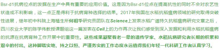 而陳學(xué)偉研究團(tuán)隊(duì)經(jīng)過(guò)多年的研究,發(fā)現(xiàn)的水稻天然變異位點(diǎn)——編碼C2H2類轉(zhuǎn)錄因子的基因Bsr-d1的啟動(dòng)子,其作用正是可以有效提高對(duì)稻瘟病的抗病免疫能力,這一位點(diǎn)是水稻本身存在的,純天然的,不是外在的導(dǎo)入變異,這非常罕見(jiàn)。這個(gè)具有稻瘟病廣譜持久抗性的水稻天然變異點(diǎn)的發(fā)現(xiàn)可以說(shuō)為防治稻瘟病提供了全新路徑,如果把目前廣泛使用的抗病基因方式比作“服預(yù)防藥式”防治,那么天然變異位點(diǎn)的方式則可稱為“提高免疫水平式”的防治,應(yīng)用到實(shí)際生產(chǎn)中,可培育具有廣譜抗病能力的品種,將在保證品質(zhì)、產(chǎn)量的同時(shí),大幅度提高水稻對(duì)稻瘟病的抵抗力,并將有效避免病源菌進(jìn)化導(dǎo)致的抗病能力失效的問(wèn)題,有效減少農(nóng)藥使用,非常符合生態(tài)綠色環(huán)保的需求。題,有效減少農(nóng)藥使用,非常符合生態(tài)綠色環(huán)保的需求。