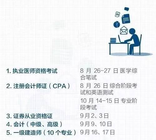 2017年已經過去一半,接下來都有哪些考試你知道嗎?①國家司法考試:9月16、17日;②注冊會計師證:8月26日綜合階段考試和英語測試,10月14、15日專業(yè)階段考試……大部分含金量高的職業(yè)資格考試都集中在下半年,現在努力還為時不晚。2017下半年48項考試時間表↓↓