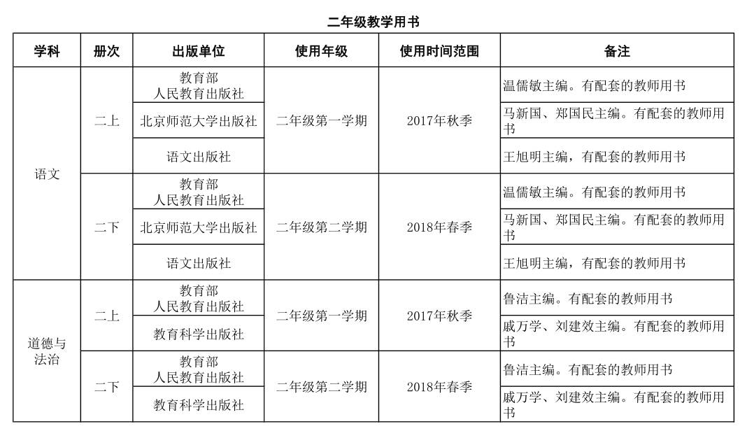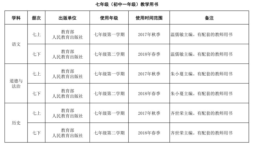 (二)2017-2018學(xué)年,道德與法治、語(yǔ)文一年級(jí)、七年級(jí)統(tǒng)一使用統(tǒng)編教材,歷史七年級(jí)統(tǒng)一使用統(tǒng)編教材。