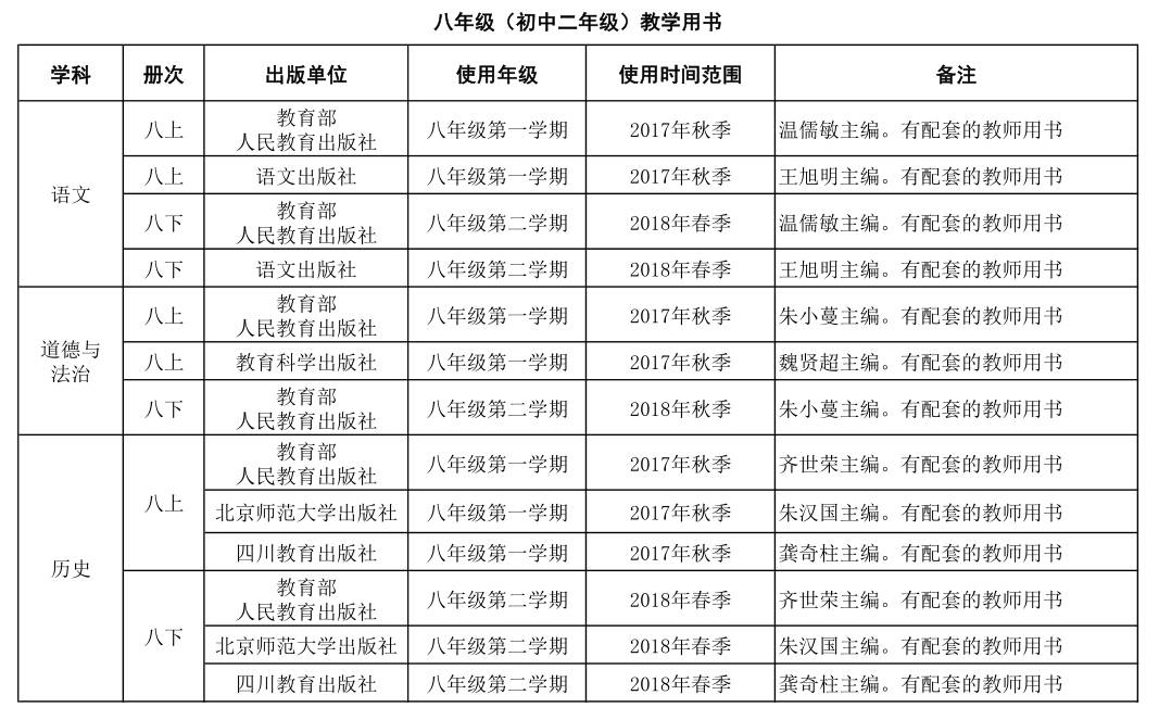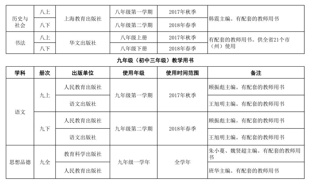 (三)2016年使用義務(wù)教育道德與法治、語(yǔ)文統(tǒng)編教材地區(qū),2017年其二、八年級(jí)全部使用審定通過(guò)的統(tǒng)編教材。全省所有地區(qū)義務(wù)教育道德與法治八年級(jí)下全部使用統(tǒng)編法治專冊(cè)教材。其他年級(jí)冊(cè)次使用原選用出版社出版的教材,不得更換版本。