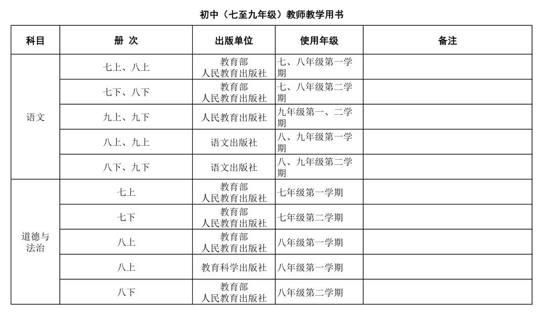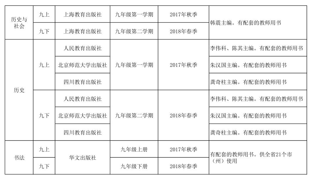 四、其他要求(一)義務(wù)教育道德與法治、語(yǔ)文、歷史、小學(xué)科學(xué)、初中書(shū)法必須使用教育部《2017年義務(wù)教育道德與法治、語(yǔ)文、歷史和小學(xué)科學(xué)教學(xué)用書(shū)目錄》《2017年義務(wù)教育道德與法治、語(yǔ)文(二、八年級(jí))統(tǒng)編教材目錄》和省教育廳《五科目錄》中的教材。