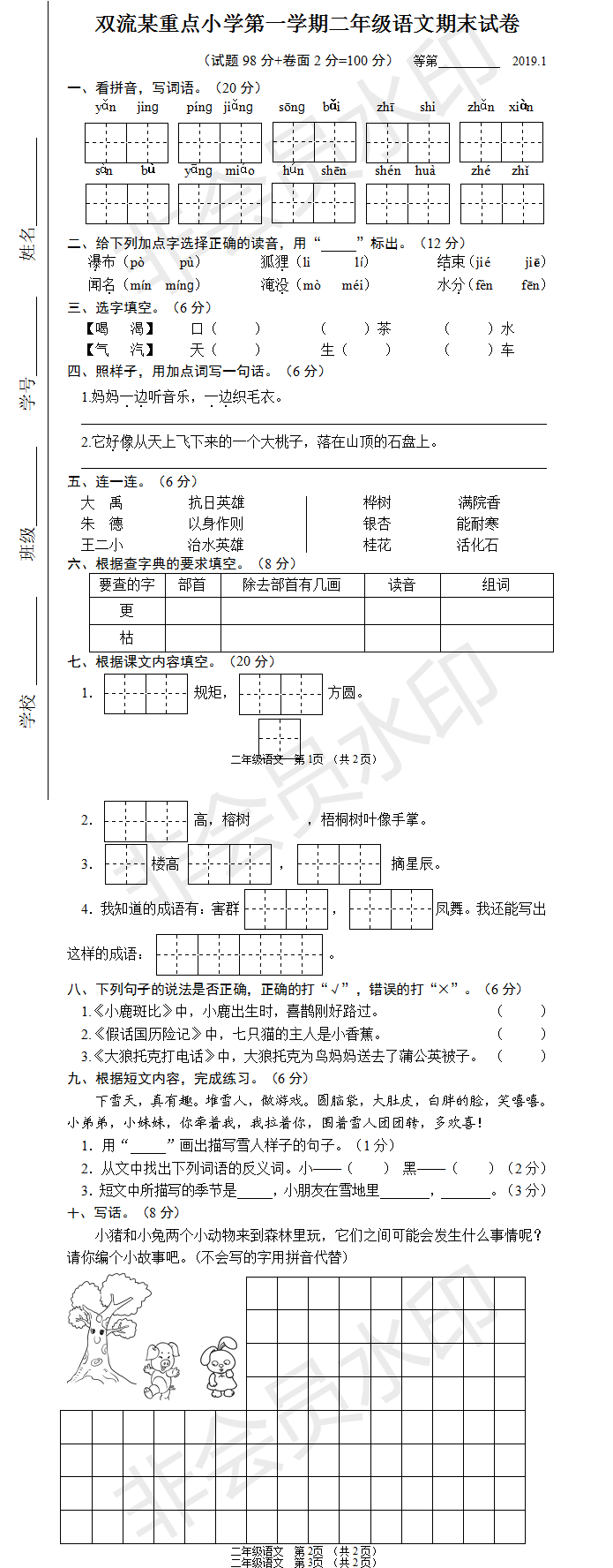 雙流某重點小學(xué)二年級上冊語文期末測試3