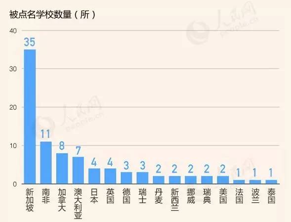 從國家來看,新加坡被點名的學(xué)校共35所,居榜首,其次是南非11所、加拿大8所。