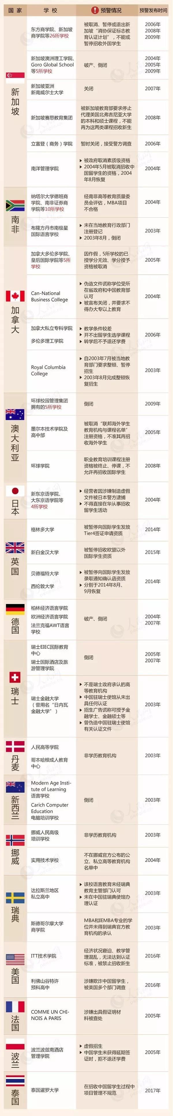 截至2017年5月,教育部共發(fā)布留學(xué)預(yù)警61期,全球范圍內(nèi)16個國家共計88所學(xué)校被教育部列上不建議中國留學(xué)生就讀 “黑名單”,上榜的院校涵蓋大學(xué)、高中、語言學(xué)校、成人教育等多種辦學(xué)層次及類型。